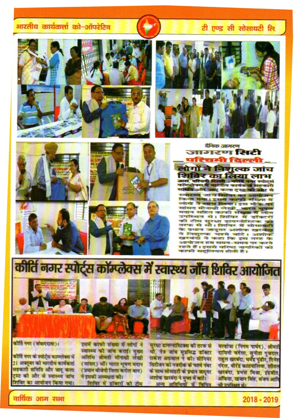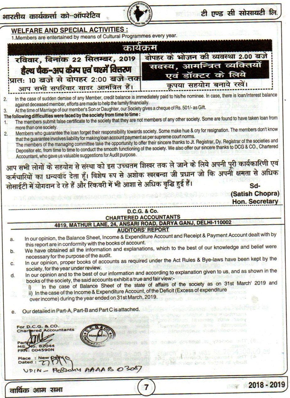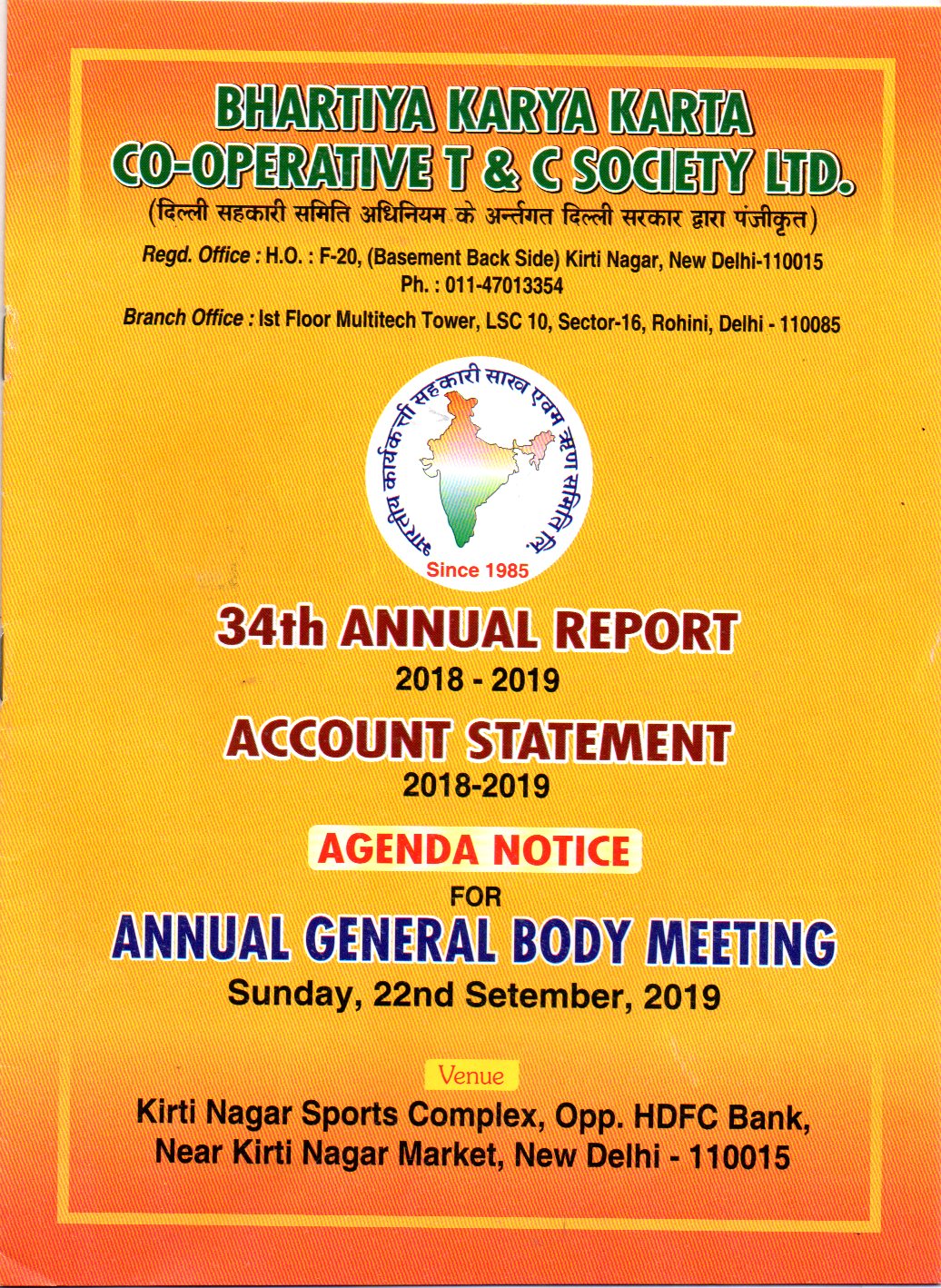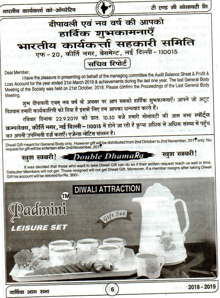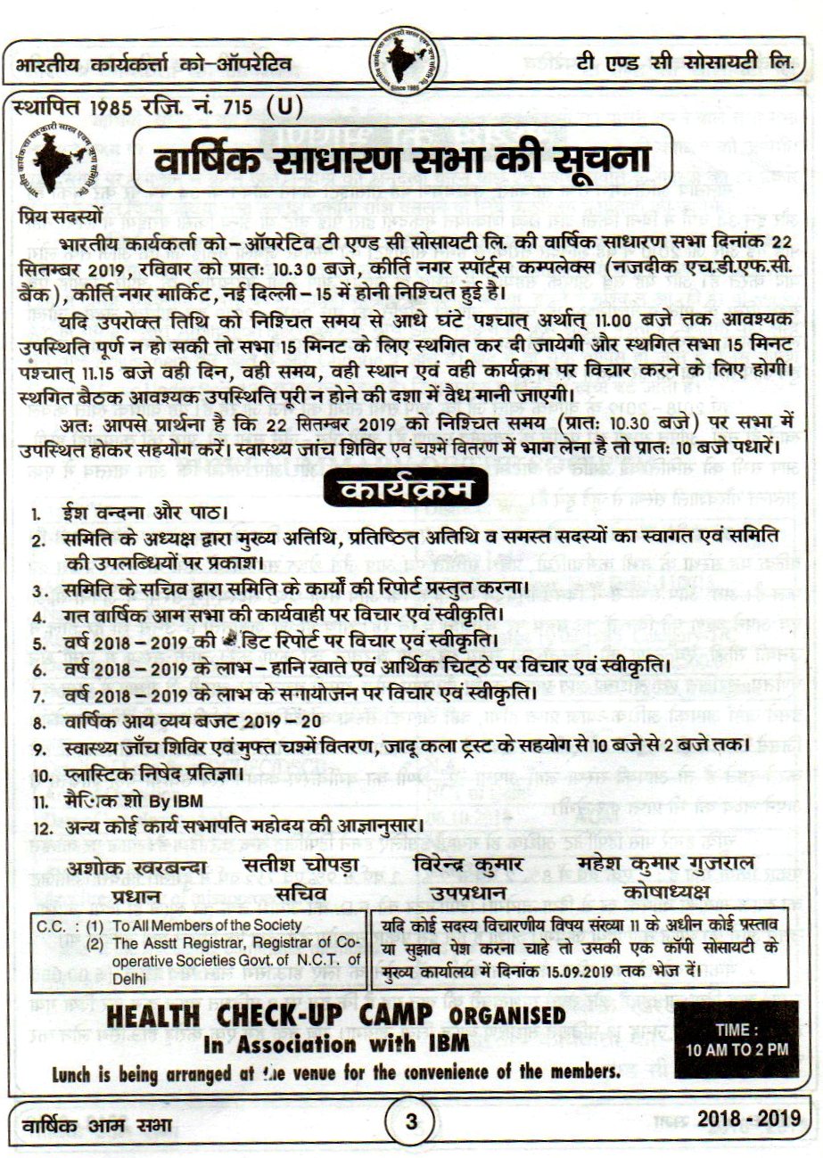 The AGM Of Bhartiya Karya Karta Co-OP T/C Society Ltd held on 22.09.2019 at Kirti Nagar Sports Complex Opposite HDFC Bank Kirti Nagar.